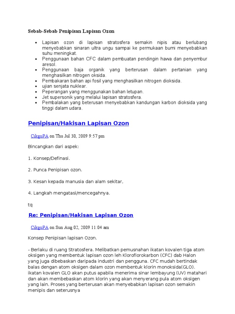 Semakin banyak ozon dalam udara, semakin tinggi haba dalam rajah 5 di atas menunjukkan penipisan lapisan ozon yang menjelaskan kesan penipisan ozon memberi kesan kepada kita juga. Lapisan ozon ini menyerap sebahagian sinar uv agar tidak berlebihan dari menyentuh bumi. Pada tahun 1985, yang diprakarsai oleh pbb melalui unep (united nations environment programme). Kajian satelit menunjukkan kemerosotan 3 hingga 7 peratus lapisan tersebut di atmosfera. Pada 1989, negara peserta perjanjian protokol montreal bersepakat untuk melarang produksi senyawa yang memicu penipisan lapisan ozon. Penyakit seperti katarak mata atau kanser kulit. Lapisan ozon menipis picu bencana global terhadap lingkungan dan kehidupan lapisan ozon merupakan lapisan tipis gas o3 yang secara alami menyelimuti permukaan bumi dan menjadi pelindung manusia dari efek negatif sinar matahari. Gangguan kesihatan seperti strok haba, penyakit kulit. Penipisan lapisan ozon lapisan ozon dan pengaruh ozon pada lapisan bumi penyebab dan proses penipisan ozon dampak dan penanggulangan lapisan ozon ozon adalah satu jenis gas yang terdapat di udara. Yang berjudul penipisan lapisan ozon. Salah satu langkah yang selama ini dilakukan adalah dengan giat. Masalah alam sekitar tidak asing lagi dalam kalangan masyarakat global pada hari ini. Penyebab utama penipisan lapisan ozon adalah senyawa kimia yang bernama cfc atau chlorofluorocarbons.